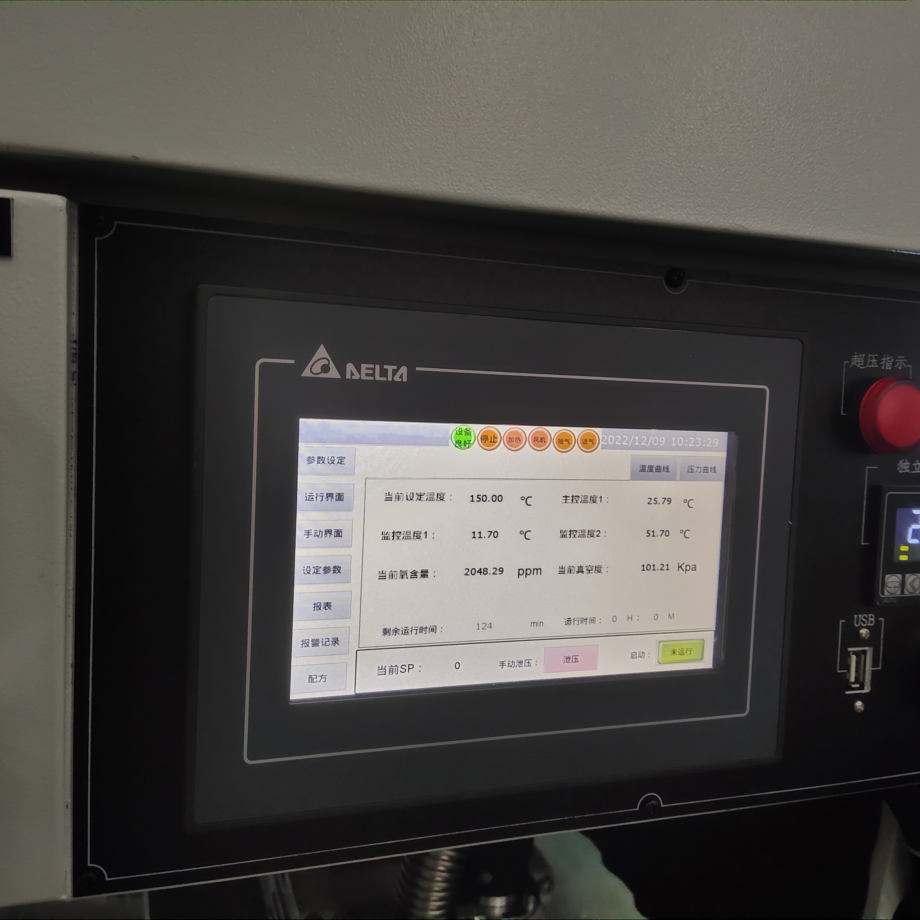 采用PLC 觸摸屏,內加熱快速升溫水冷卻管道快速降溫,數字壓力傳感器,旋片油泵,氧含量濃度檢測,三色燈,獨立接口氮氣正壓力監(jiān)控器連接電磁閥釋放氣體。