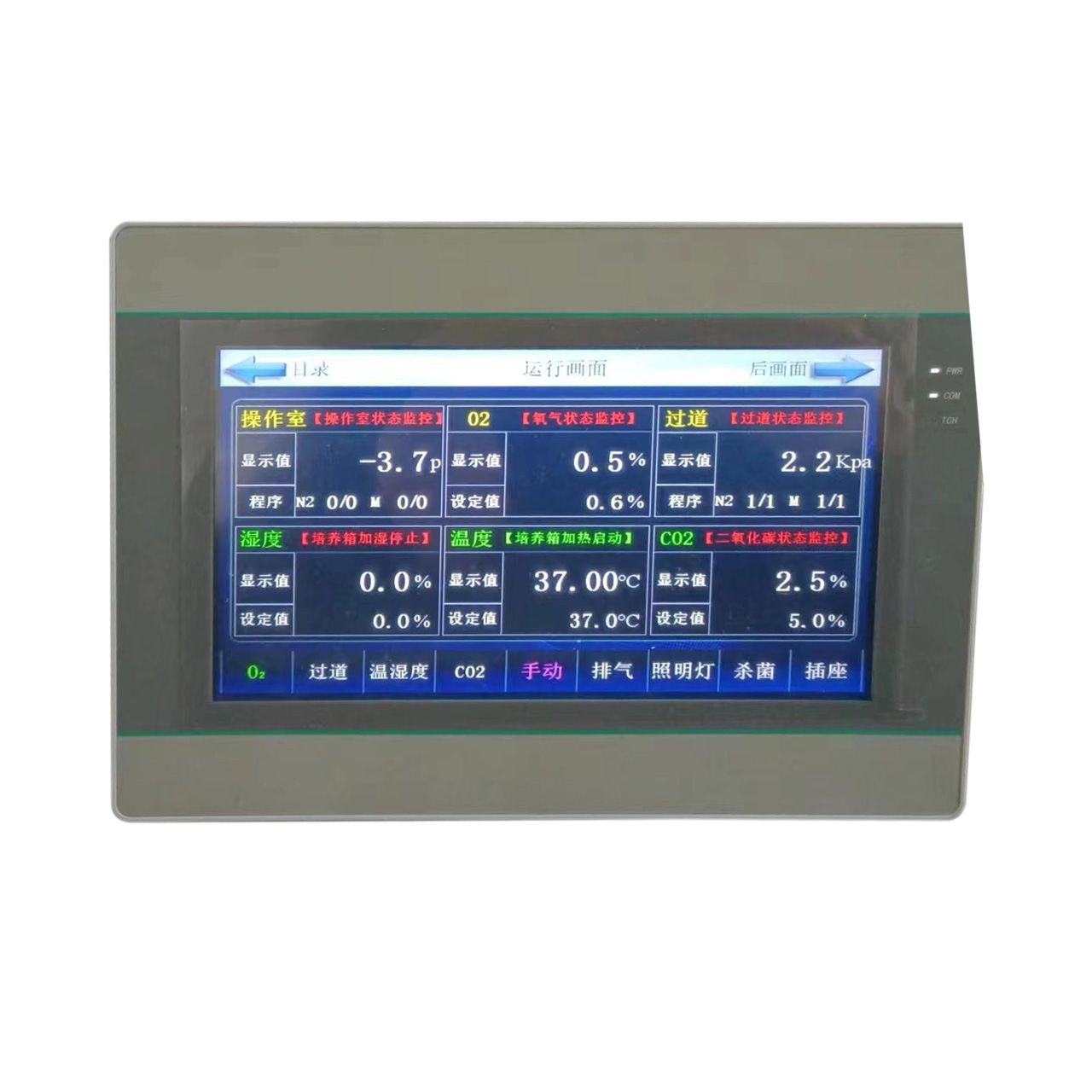 2. 采用PLC模塊控制系統(tǒng),溫度控制采用微電腦智能PID溫度控制模塊、能準(zhǔn)確反映及控制培養(yǎng)箱內(nèi)溫度,在同一個(gè)控制界面可監(jiān)控溫度值、濕度值、CO2濃度值、O2濃度值。